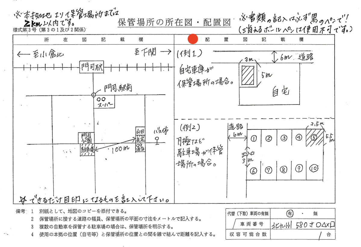 この記事では、北九州市(門司・小倉・八幡・若松)で車庫証明を申請する方向けに、所在図・配置図の正しい書き方と注意点 を、行政書士が分かりやすく解説します。