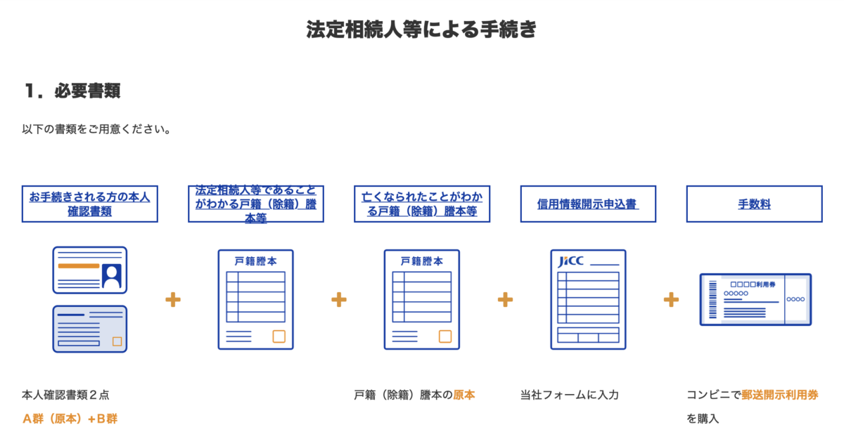 JICCの公式サイトでは、亡くなられた方(父・母・配偶者・子)の開示手続きに必要な書類として、主に次のものが示されています。