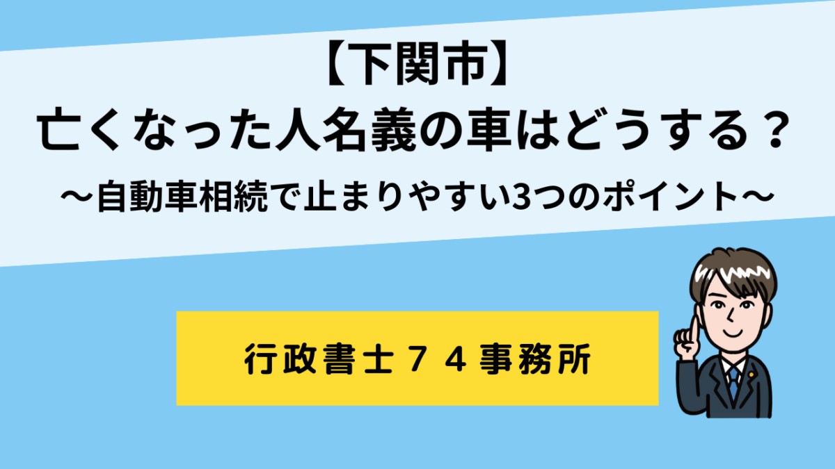 はじめに 親や配偶者が亡くなったあと、意外と多くの方が悩まれるのが 「車の扱い」 です。 名義は亡くなった人のままだけど、運転していいの? 相続の話がまとまっていないけど、手続きは進められる? 売る・廃車にする時は何が必要? 下関市でも、「自動... -