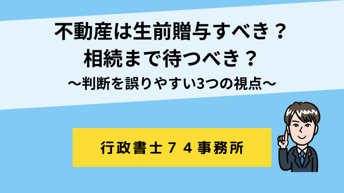 はじめに|「不動産は早めに贈与した方がいい」と思っていませんか? 相続や遺言のご相談を受けていると、次のような声をよく耳にします。 「自宅は生前に子どもへ贈与した方がいいですよね?」「不動産は早めに名義を変えた方が、相続が楽だと聞きました... -