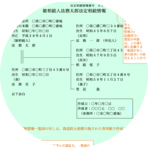 この一覧図は法務局で認証を受けることで、銀行や不動産などの相続名義変更手続きにおいて、戸籍謄本の束に代わる公的な書類として利用することができます。