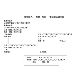 相続関係説明図とは、被相続人(亡くなった方)とその相続人の関係を図で示したもので、主に遺産分割協議書や金融機関での相続手続きの際に添付される書類です。