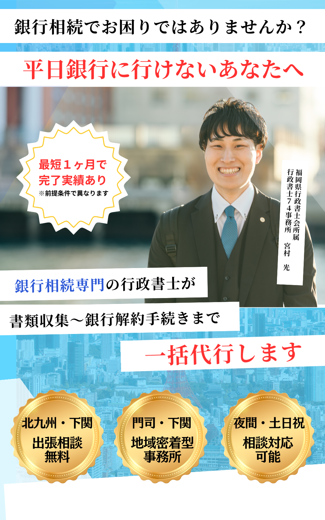 当事務所は関門エリアの多数の金融機関で実績があり、経験豊富な行政書士が対応。お客様に代わってスムーズに進め、不安を解消して、安心して相続ができるようサポートします。