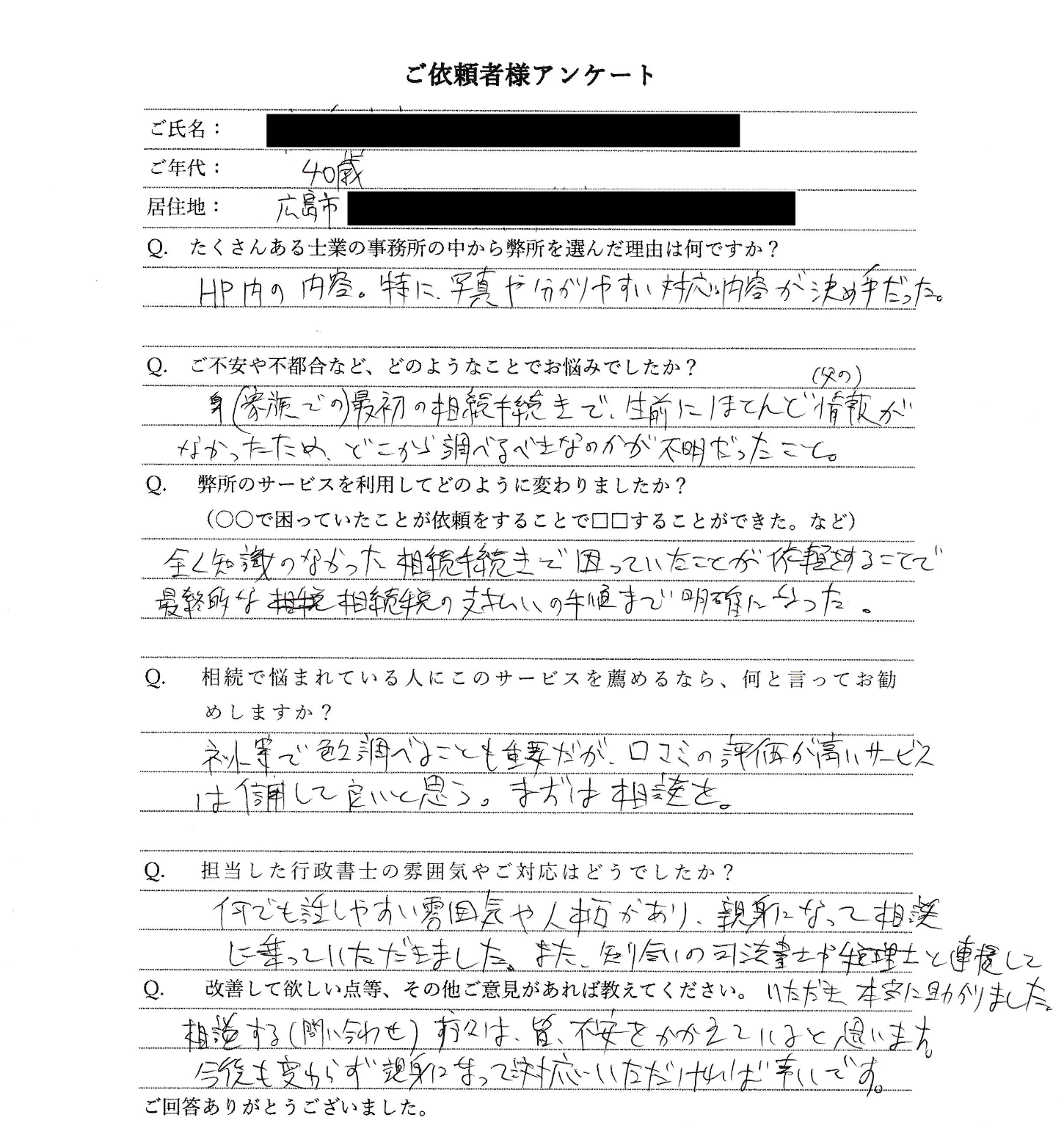 親の預貯金の相続一連の手続き、自分が行政で必要書類を取得したのも勉強になったし、他の複雑な接渉事は全てご一任でき、気持ち的に負担が軽減できた。